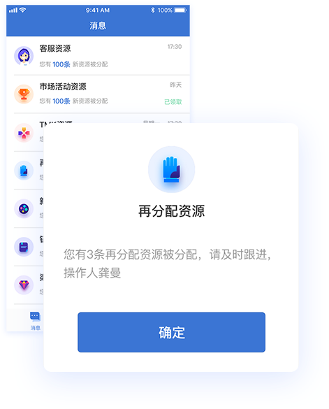 一键领取资源,各团队可自由定制领 取时间,完善的消息推送机制。